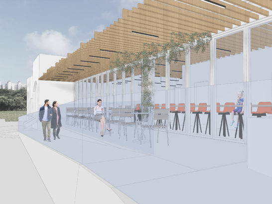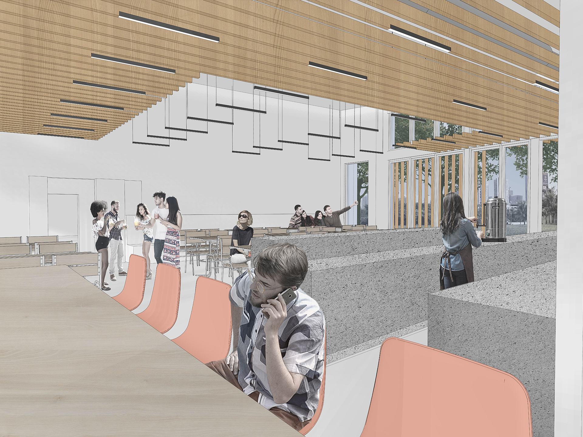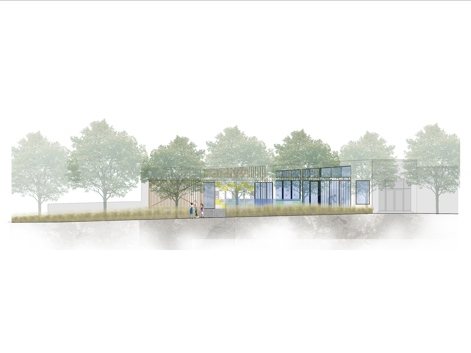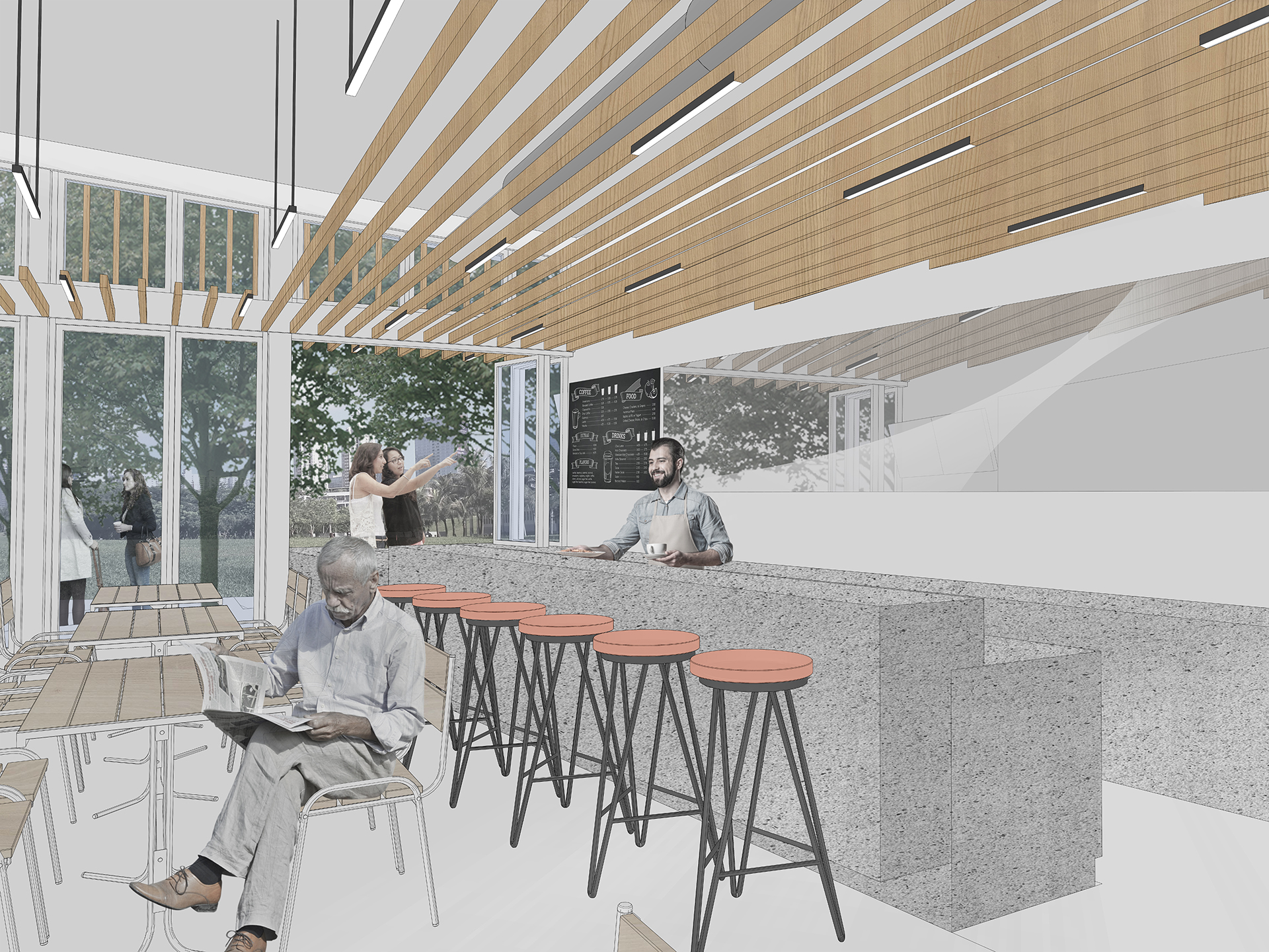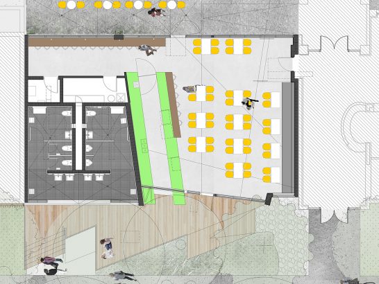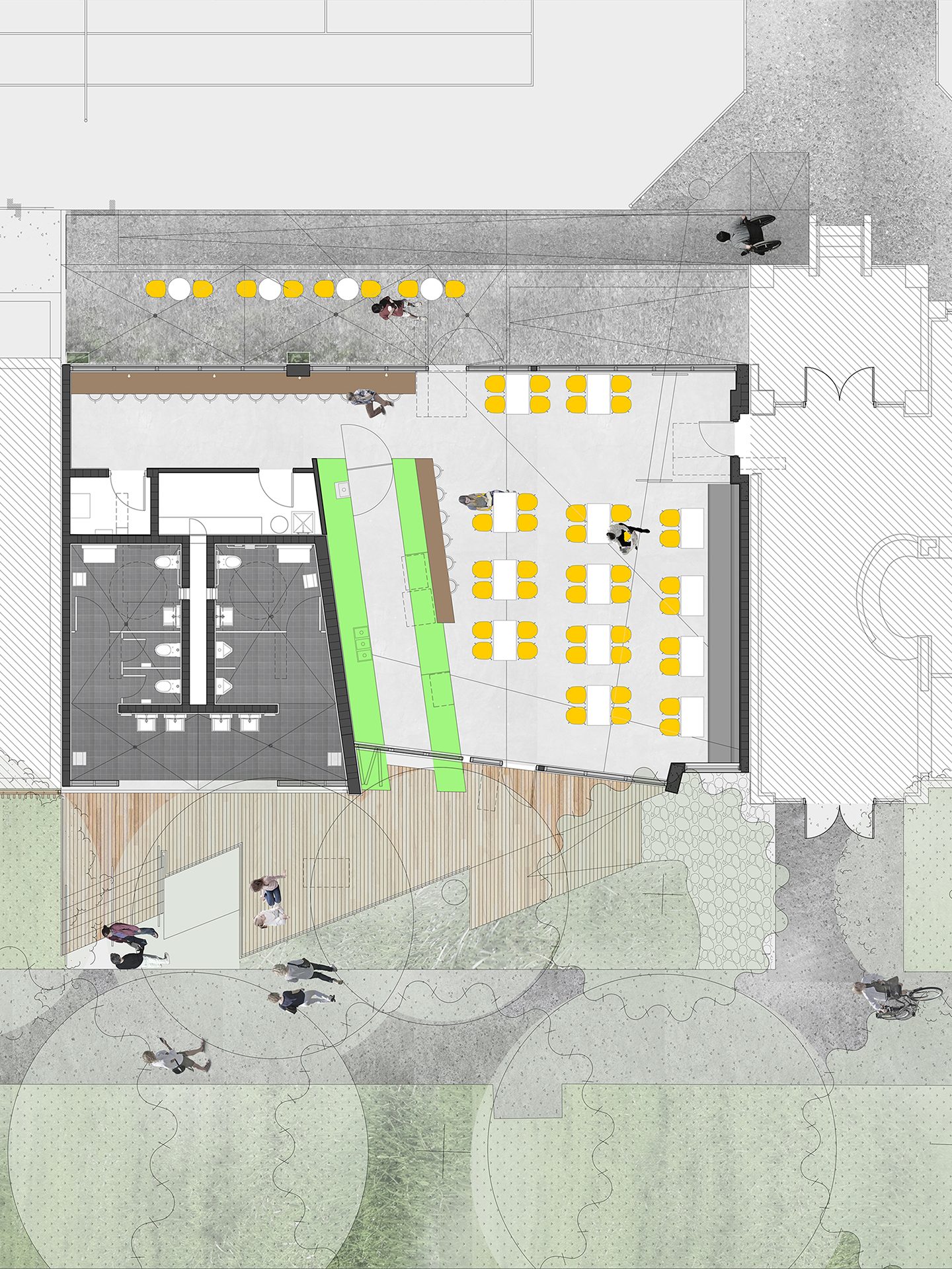 The North Shore Park & Youth Center addition is an infill building project located within an existing recreational park facility owned and managed by the City of Miami Beach, Florida. To the south of the North Shore Tennis Center, between two existing structures, this urban infill development responds to its’ subtropical climate, urban setting, and community uses framed by a deep overhang with full height wall to wall windows through which natural light is filtered and views are extended toward the surrounding park. The program includes restrooms, an interior café space with an outdoor raised dining area and maintains the existing tree canopies. Glavovic Studio selected materials and color palette work sympathetically and in contrast with adjacent existing building conditions. Bright white walls capture the tree canopy shadows, a bright sunny yellow recessed opening draws park users to the space, with polished concrete floors, recycled deck, and outdoor seating.