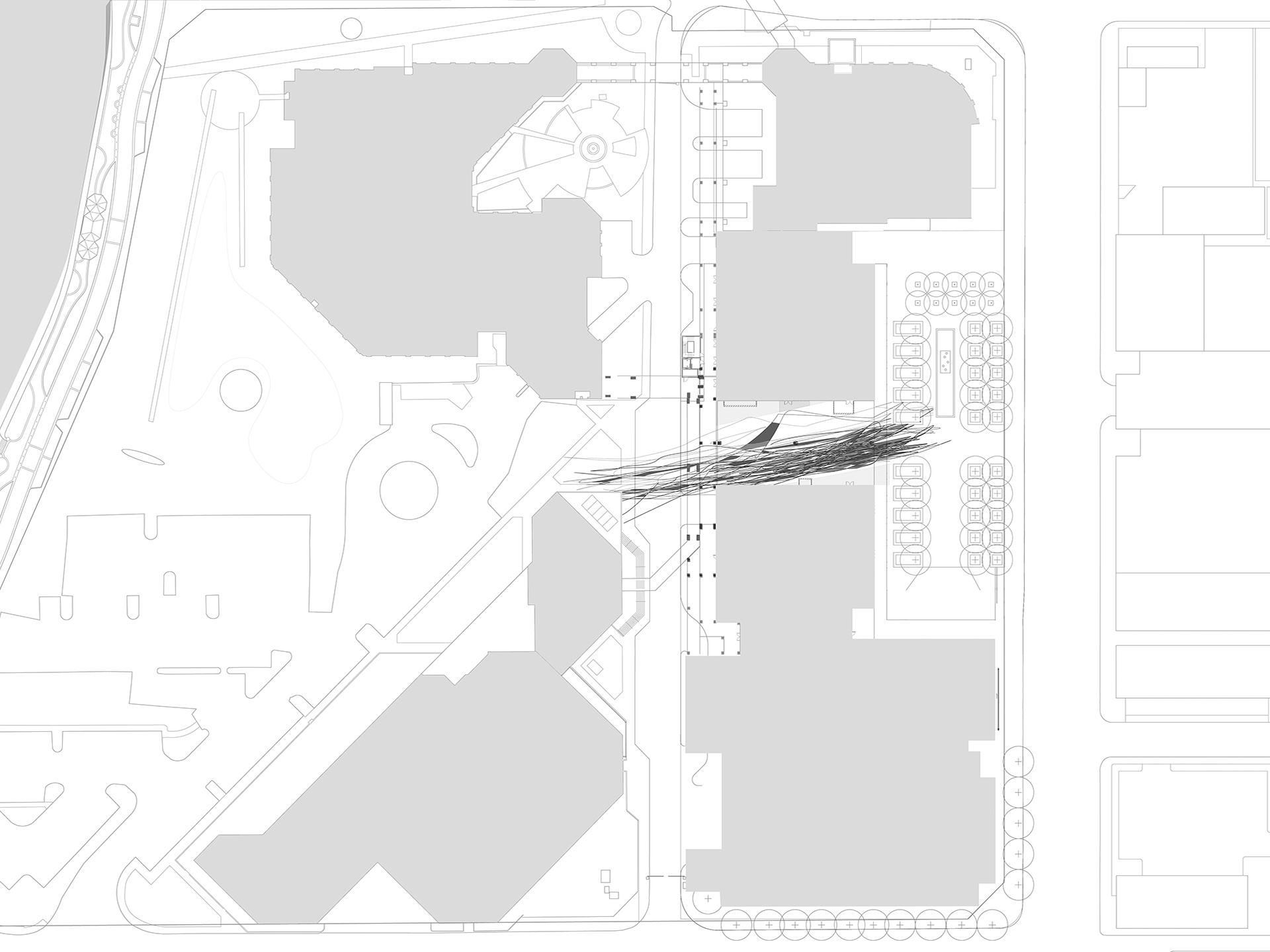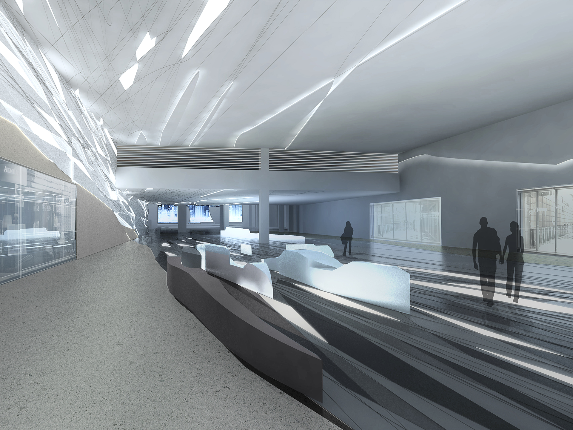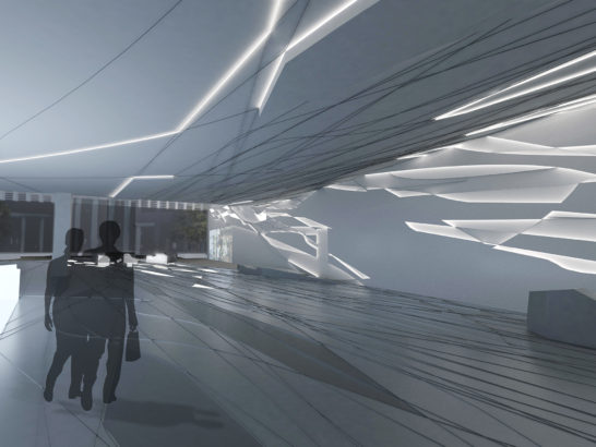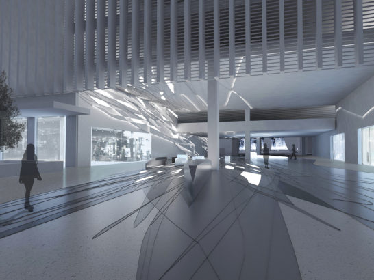 The new Broward County Courthouse campus was built to give the local court system much needed breathing room with a new 714,000-square-foot tower and ancillary buildings. Situated on a 1.5-acre lot, this tower needed to connect, via a public access breezeway, with a massive and impersonal parking garage. This breezeway is comprised of 9,000-square-feet of covered space and was selected as the site for a public art project by Margi Glavovic Nothard, titled FLOW. The installation is designed to run the full length of the breezeway at the base of the tower and parking structure. The idea behind the project was to turn a non-descript connecting passage into a dynamic procession, recalling the New River, the only river to run from the Everglades to the Atlantic Ocean, entirely within Broward County. Nothard found the width of the New River to be almost identical to the width of this breezeway space, allowing to explore aspects of the river itself and translate some of those elements into a permanent, multimedia installation that would be experienced by hundreds, perhaps thousands, each day. This does not translate to art that sits on a pedestal, but rather work that engages the entire space, floors, walls, ceiling, concrete, glass, lights, and more. Nothard felt that creating public art that truly engages those who simply walk by it is an endeavor, but worth every effort as it enriches our cities and the experiences we have within them. The intent is to activate a pivotal, urban space with lighting that interacts with the movement of passersby. In addition, raised, nature-inspired forms, designed to double as seating, create not just a walk-through afterthought, but as a visually compelling space that offers those who enter an ‘urban hub’ in which everyone pauses, reconnects, and re-exchanges with the environment and each other. Broad views beyond the space make certain those who pass through are aware of the city that surrounds them. Nothard’s goal was to visually connect this space and Broward’s own river to the Courthouse, the city and the community highlighting a walkway that, without the public art/urban intervention, one might just otherwise pass through.