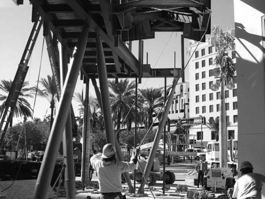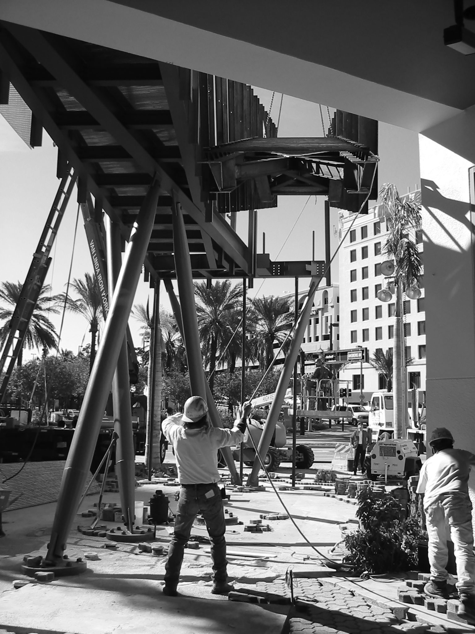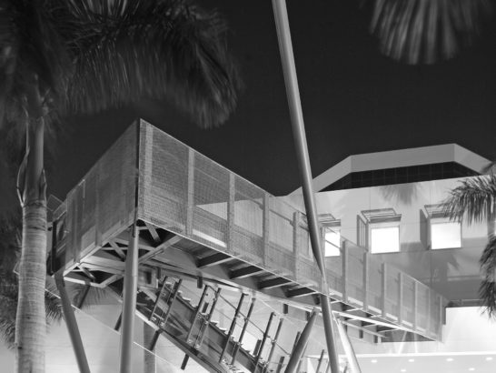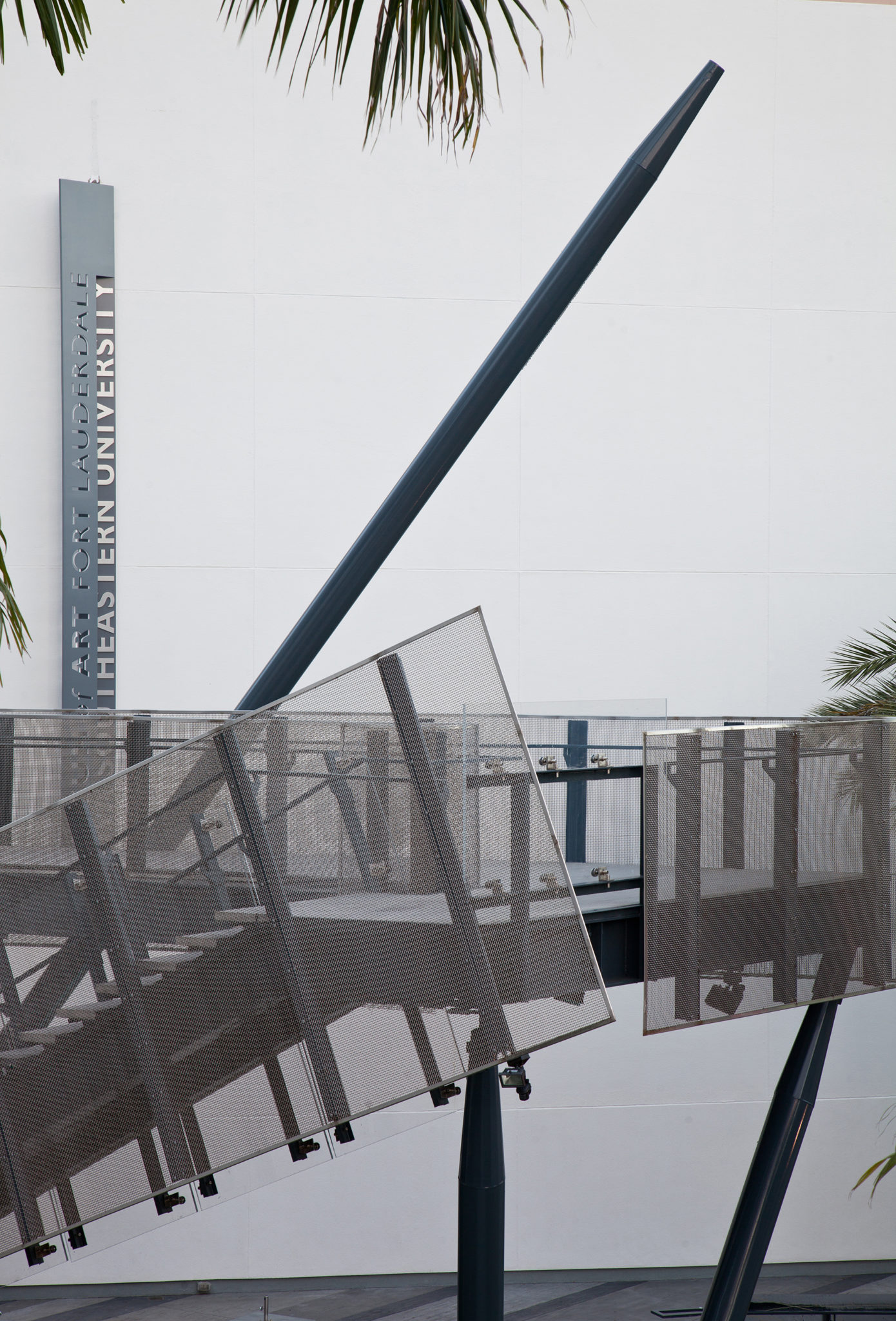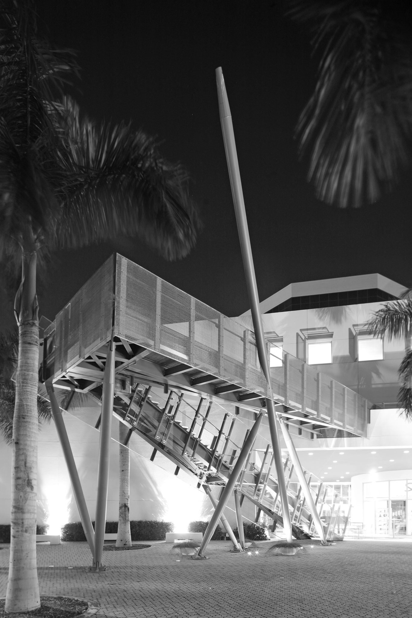 Bridge_Stair, a monumental sculpture affords visitors a view of the New River. The two story steel and polycarbonate panel sculpture was conceived as a viewing platform and shadow play on the existing museum exterior walls. The project arose out of the immediate program necessity for an entrance stair to the second level terrace for the King Tutankhamen exhibit in 2006. The urban and architectural strategy for the stair/sculpture was to reinforce the primary role of a downtown museum, creating a vibrant public plaza and supporting the existing building entry sequence. Movement, landscape, and form are celebrated in this intervention as people occupying the stair cast shadows and animate the museum’s exterior walls. Threshold is large scale site specific artwork conceptualizing water and surface, inscription and materiality through the lens of Florida’s natural environments.