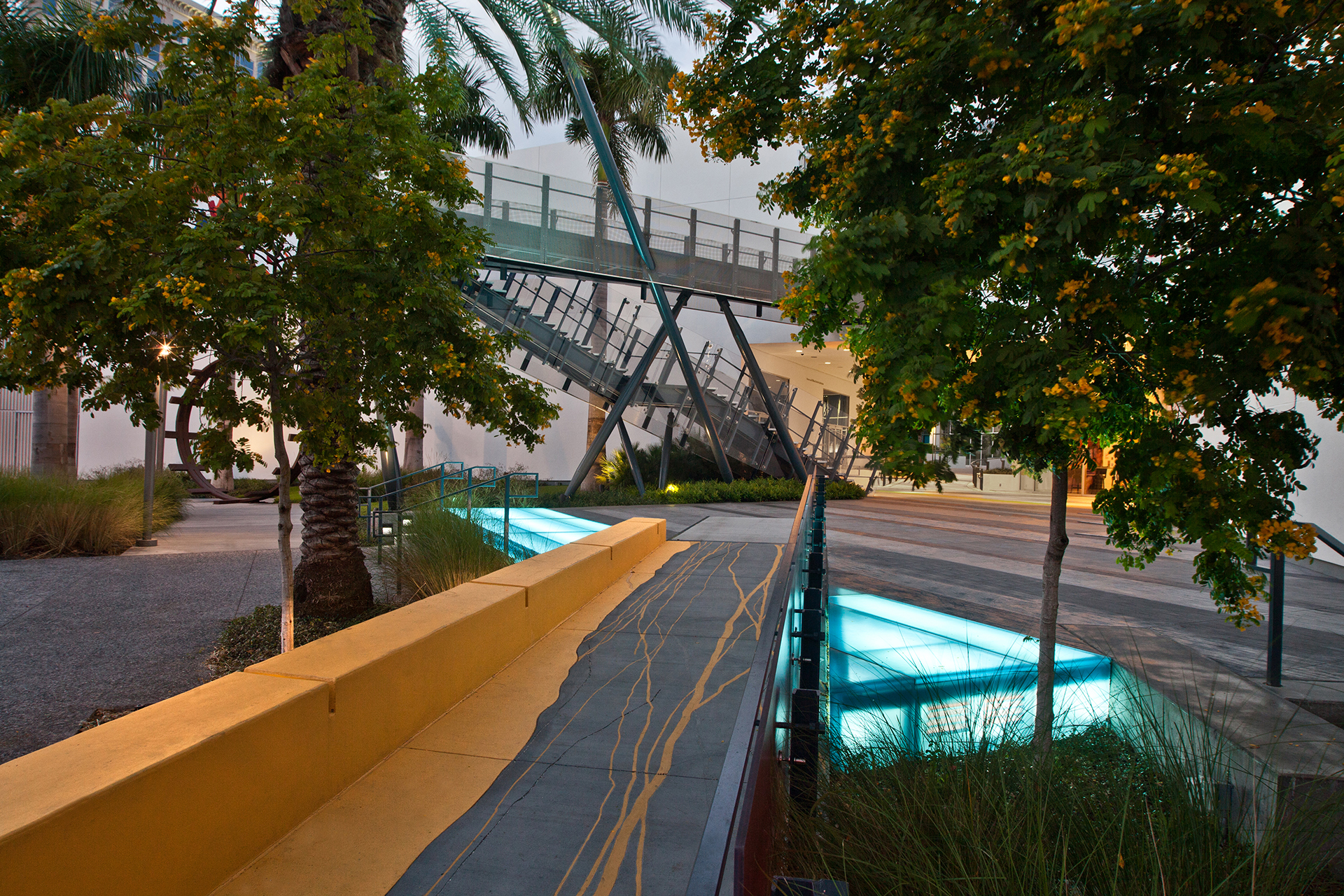 Sited on Las Olas Boulevard, the installation reinforces the urban edge and thoughtfully resolves accessibility through a sandblasted ground plane drawing/bench and eco resin photo montage/railing floating above a blue 7’ x 44’ glowing glass box. Additional native grasses planted around the work provide a slower and softer transition between the city’s sidewalk and the Museum’s Plaza . Interior renovations including the design of a new lobby coupled as a café service bar and a reconfiguring of the gift store. A visitor favorite are the renovated museum bathrooms. Photography by Robin Hill.
