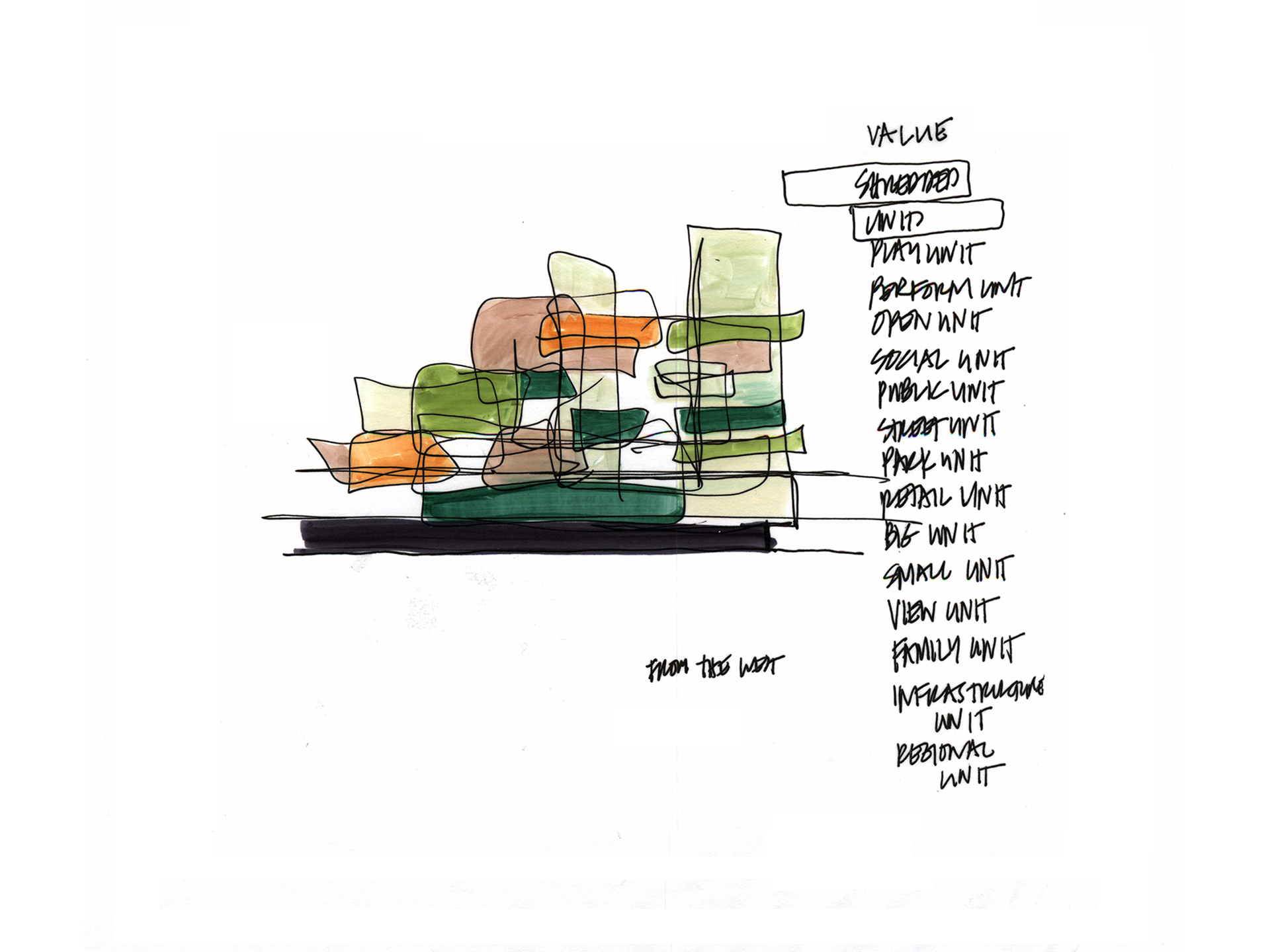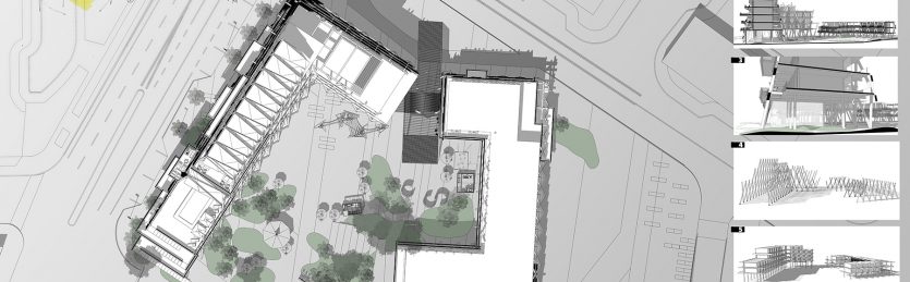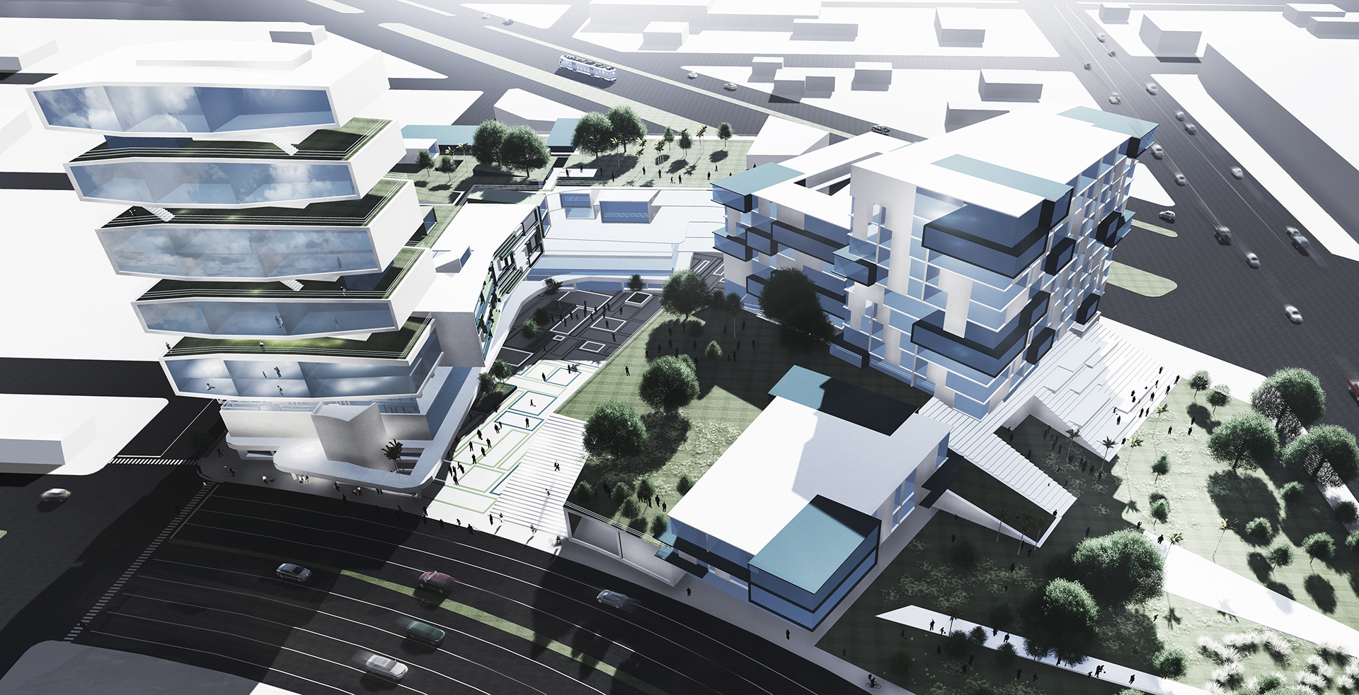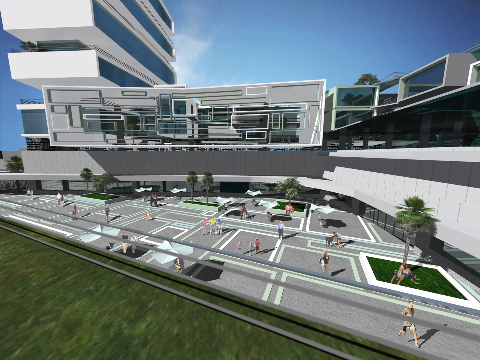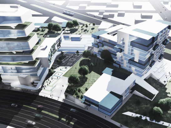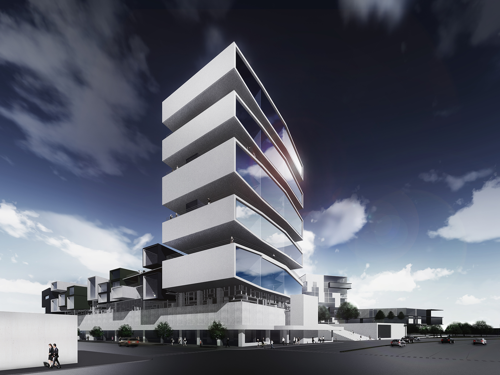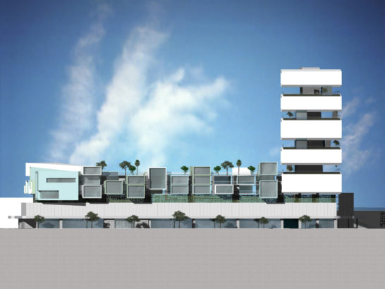 Developed as part of a HOME Fort Lauderdale magazine charrette titled Reimagining the City, GLAVOVIC STUDIO’S “Sears Town Vision” began with a deeper examination of a woefully underutilized mid-century shopping center. The team identified elements—site, architecture, transportation, and more—that might be underscored and expanded upon to transform this site into a vibrant project for its next 50 years. The result was a dynamic development that used the sweeping curves of the original structure, as well as its outmoded acre of asphalt parking, as jumping off points. The design transforms the shopping center into a vibrant, mixed-use plaza that includes a tower with a stacked-tray design and facades with incredible variations in terms of fenestration and indoor/outdoor space. The project utilizes the concept of the unit to transform the site. The units therefore become tools for redevelopment: they are living units, play units, cultural units, performing units, social units, retail units, and the aggregate of the units reconnects the community, incorporating landscape, form, and light in a new paradigm. Situated near the geographic heart of Fort Lauderdale, Sears Town enjoys a privileged location but lacks a core; the center is void. It is central to neighborhoods on four sides, a potential future passenger rail and a greenway rail, the largest recreational park in the city, and is the visual culmination of the Federal Highway and beach intersection. The project incorporates an urban design framework that reinforces connections to neighboring communities, as well as setting Sears Town as a visual marker from downtown. Affordable housing, market rate housing, cultural space, and public space all coexist in an architecturally resonant environment.