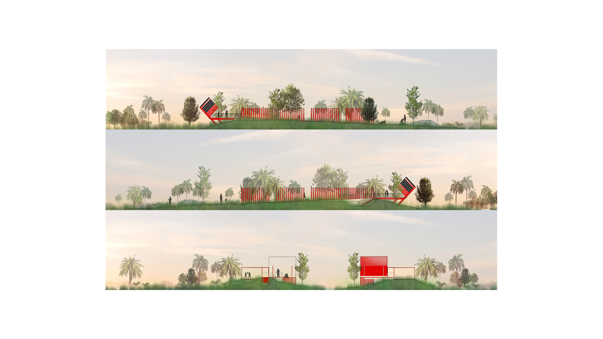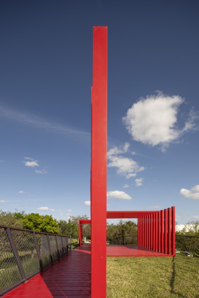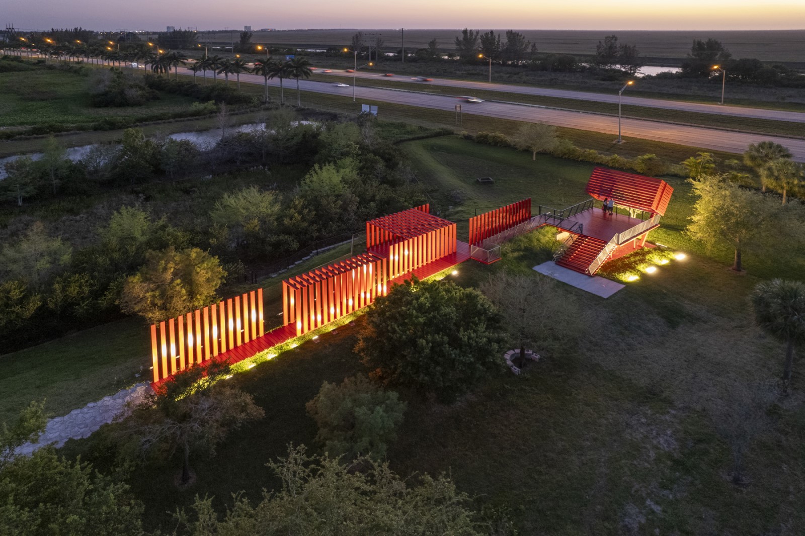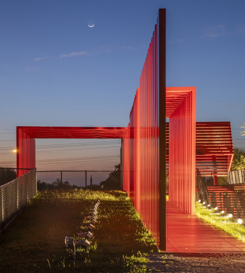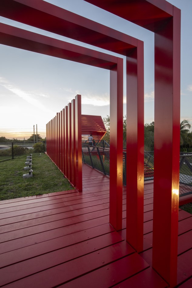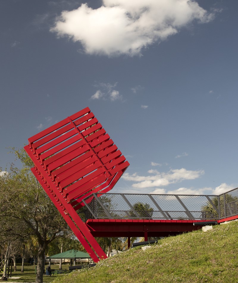 Sunset Hammock, a monumental environmental public art commission by Margi Glavovic Nothard, located in Sunset Point Park, Tamarac, Florida raises awareness about the critical role of the Everglades within the ecological balance of South Florida. The art project renders saturated moments in time as the day reveals itself, increasing its intensity in color, view, and connectivity to the largest subtropical wilderness in the United States. This concept for a public art sculpture juxtaposes the expansiveness of the Everglades and infrastructure with a 200’ long modular rhythmic red aluminum structure and 20 by 3 foot community periscope for public viewing of the Everglades. Sunset Hammock incorporates the adjacent wetland with a Sunset community park and includes an educational children’s art program in collaboration with Young at Art Museum. This project has been awarded an NEA Our Town Grant.