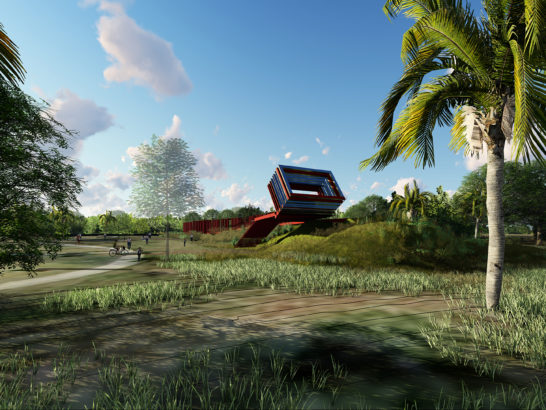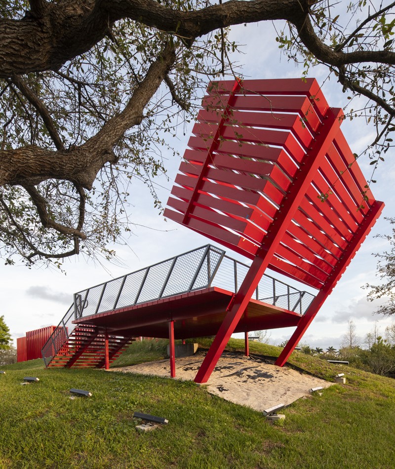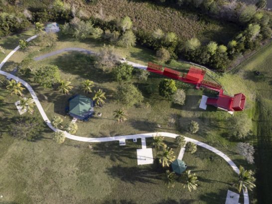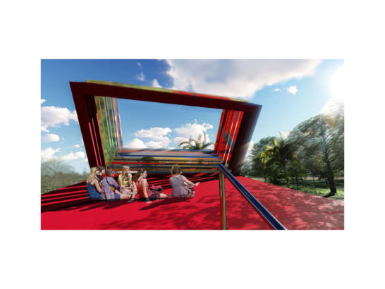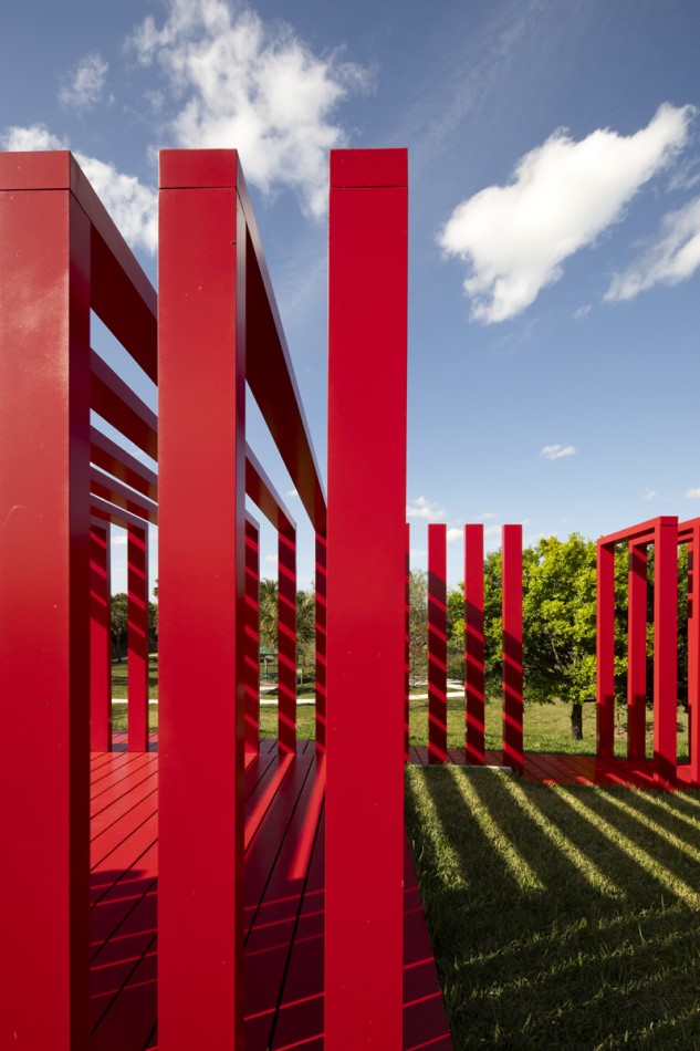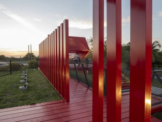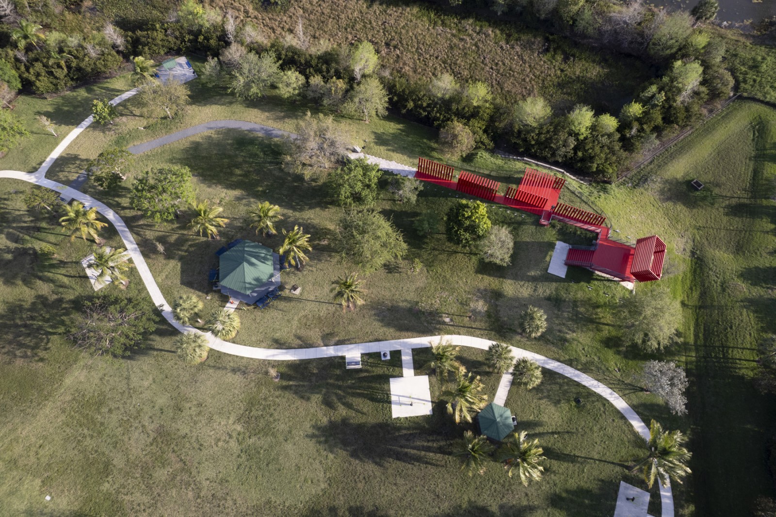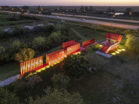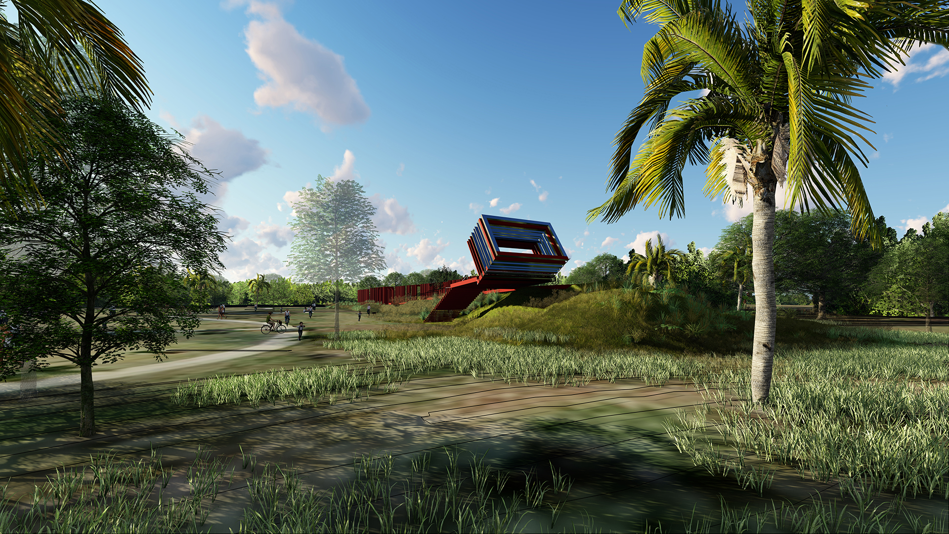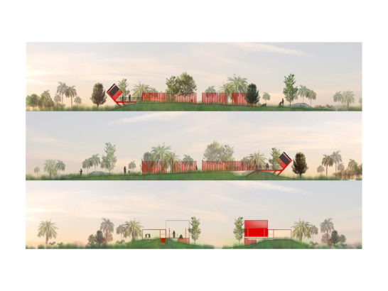 Sunset Hammock, a monumental environmental public art commission by Margi Glavovic Nothard, located in Sunset Point Park, Tamarac, Florida raises awareness about the critical role of the Everglades within the ecological balance of South Florida. The art project renders saturated moments in time as the day reveals itself, increasing its intensity in color, view, and connectivity to the largest subtropical wilderness in the United States. This concept for a public art sculpture juxtaposes the expansiveness of the Everglades and infrastructure with a 200’ long modular rhythmic red aluminum structure and 20 by 3 foot community periscope for public viewing of the Everglades. Sunset Hammock incorporates the adjacent wetland with a Sunset community park and includes an educational children’s art program in collaboration with Young at Art Museum. This project has been awarded an NEA Our Town Grant.