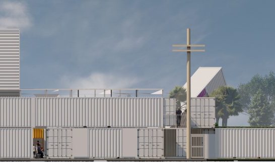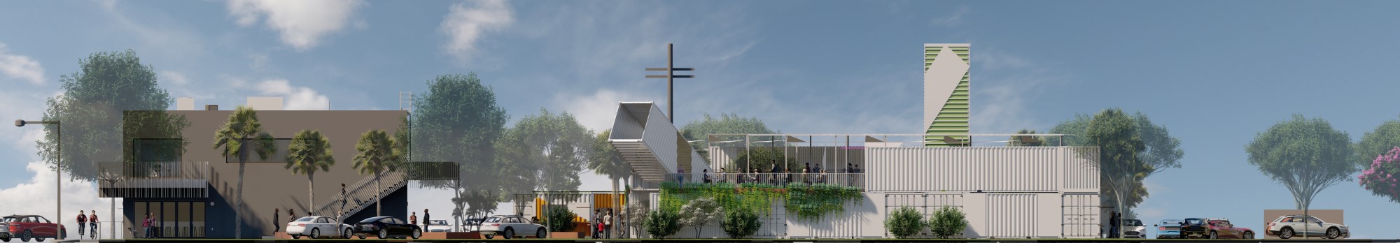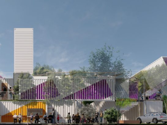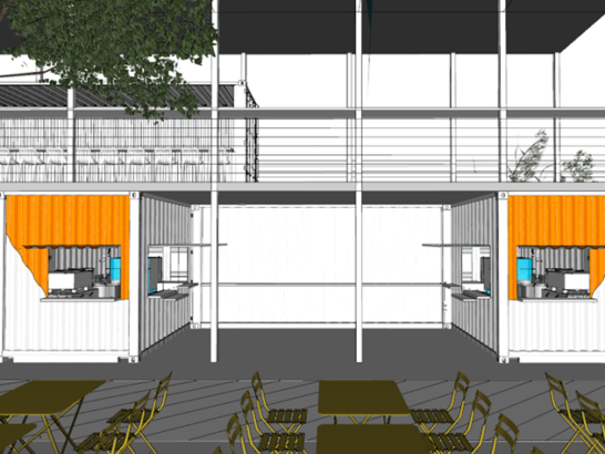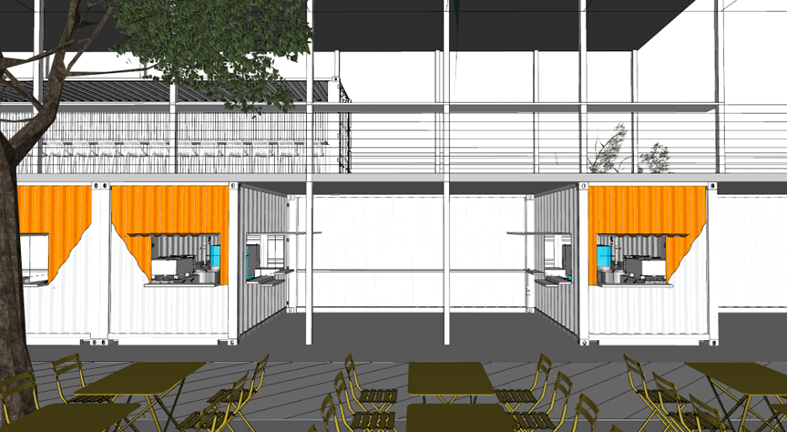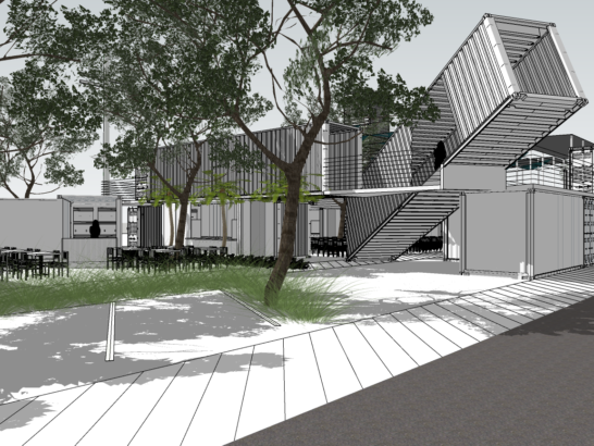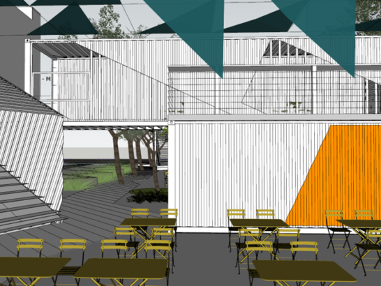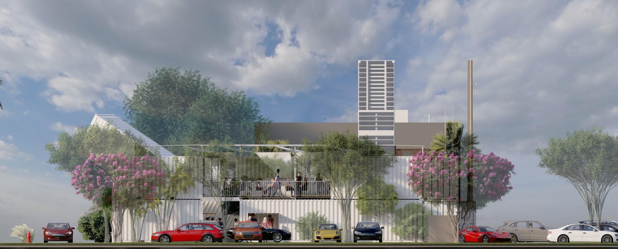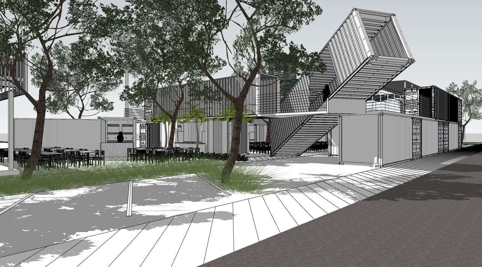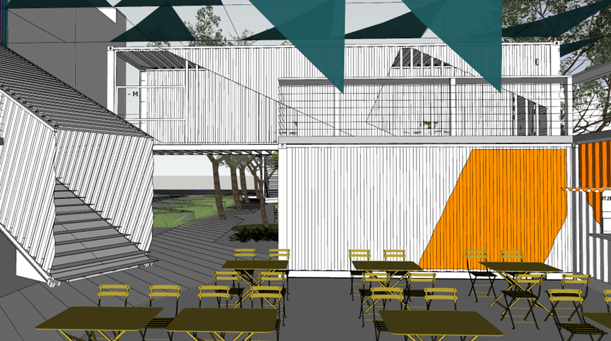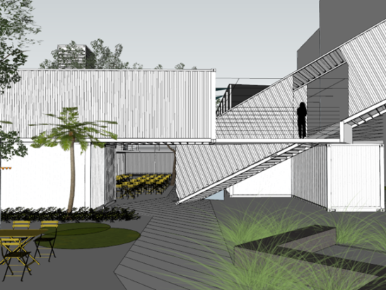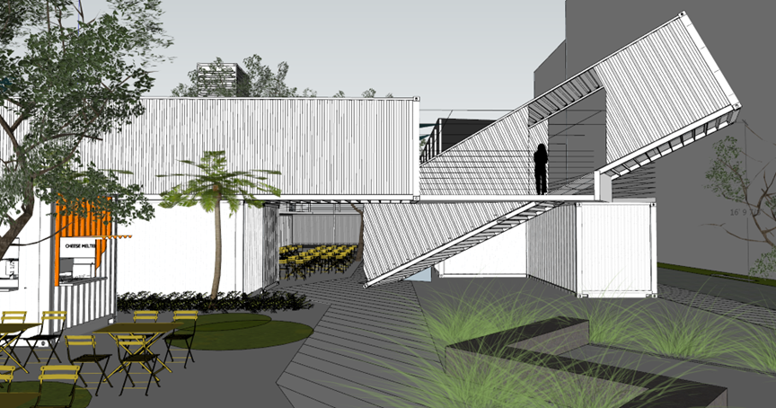 This project is conceived as a lushly landscaped outdoor space featuring repurposed shipping containers. For decades, shipping container architecture has been popular across the globe as a sustainable design solution by repurposing such containers to create and design new intentional ways for buildings.