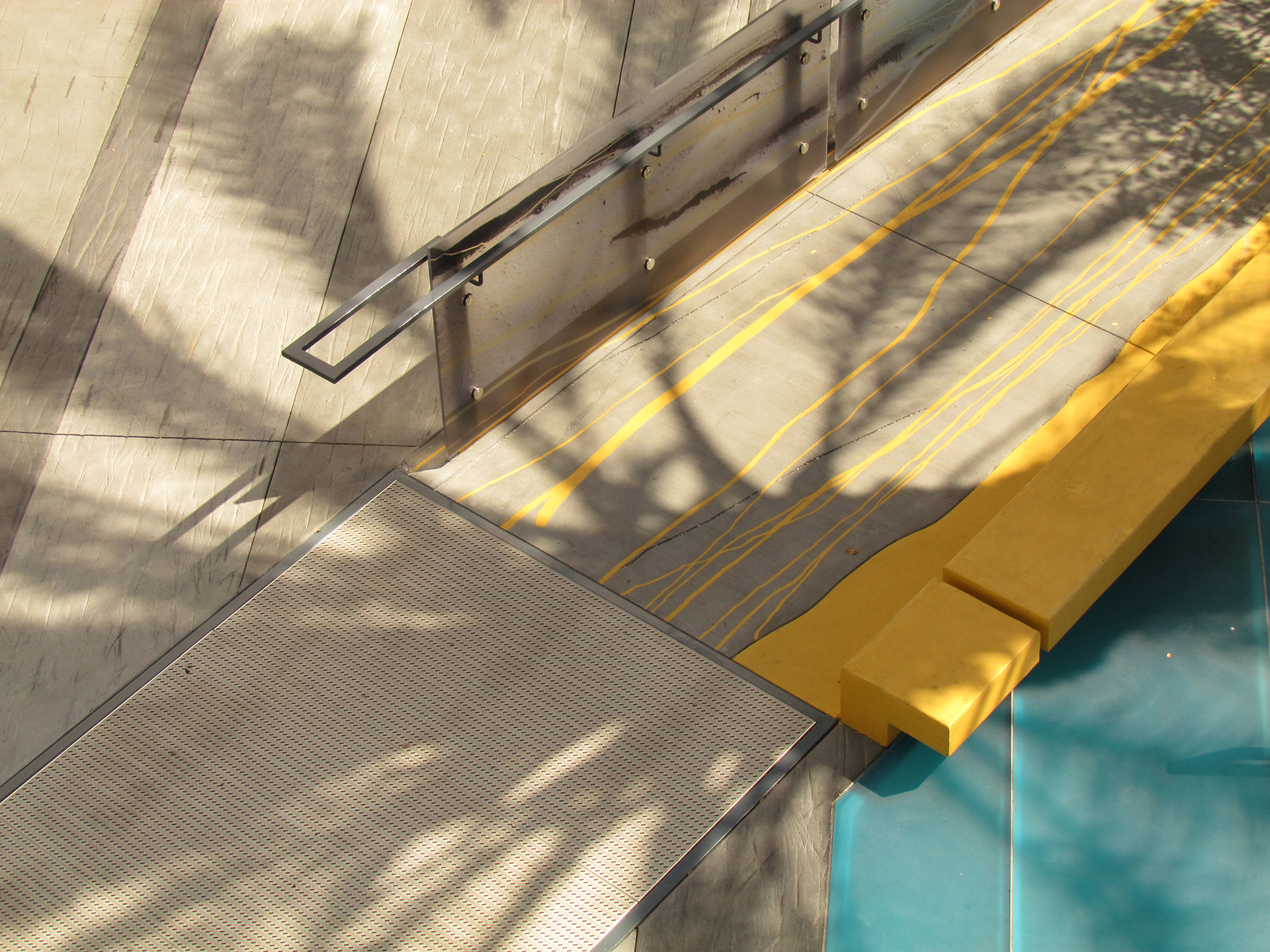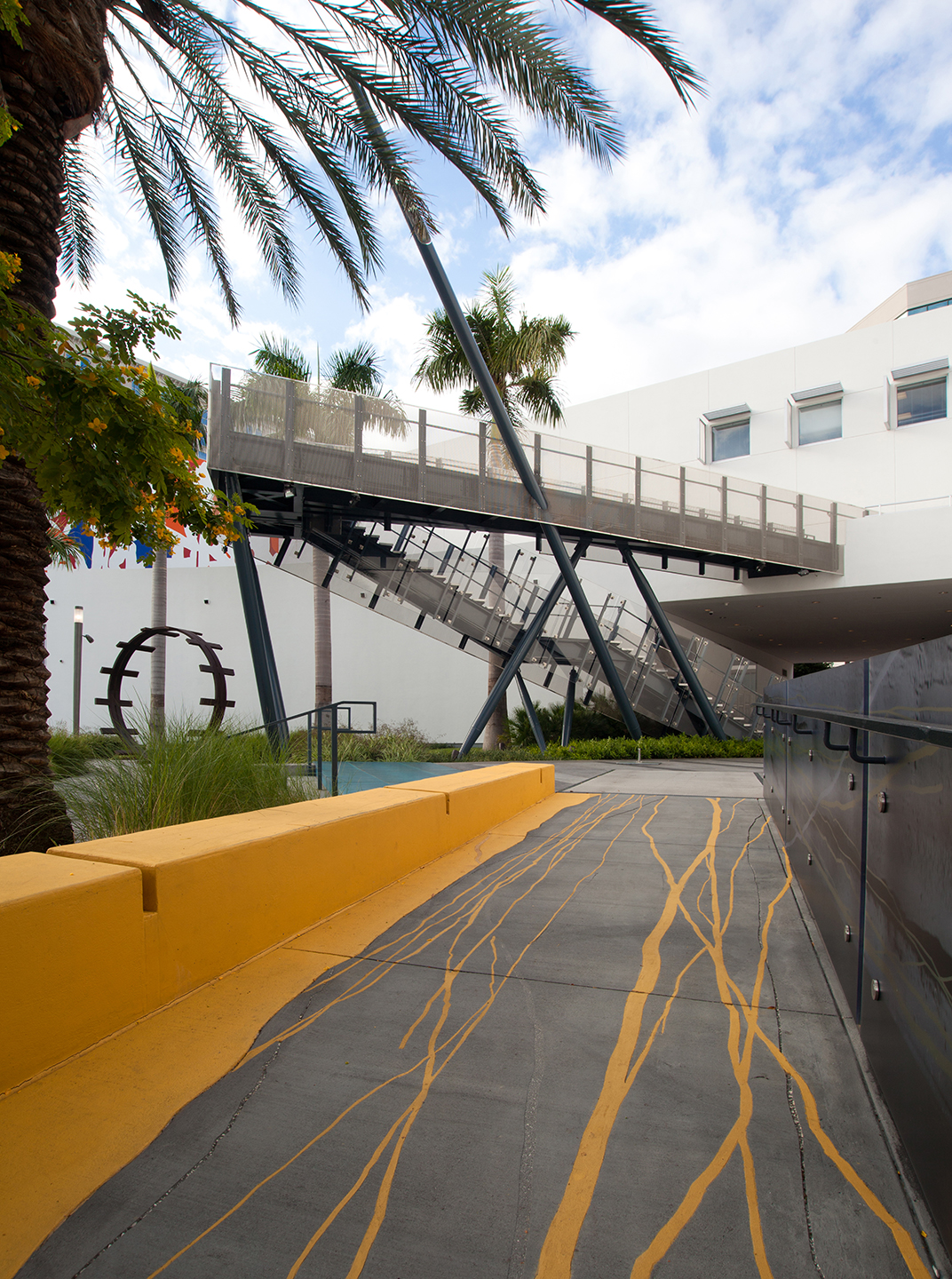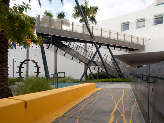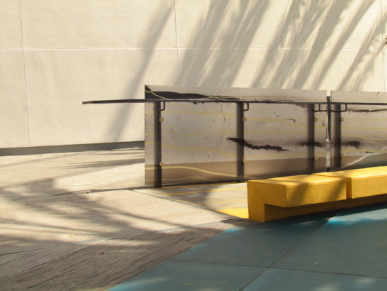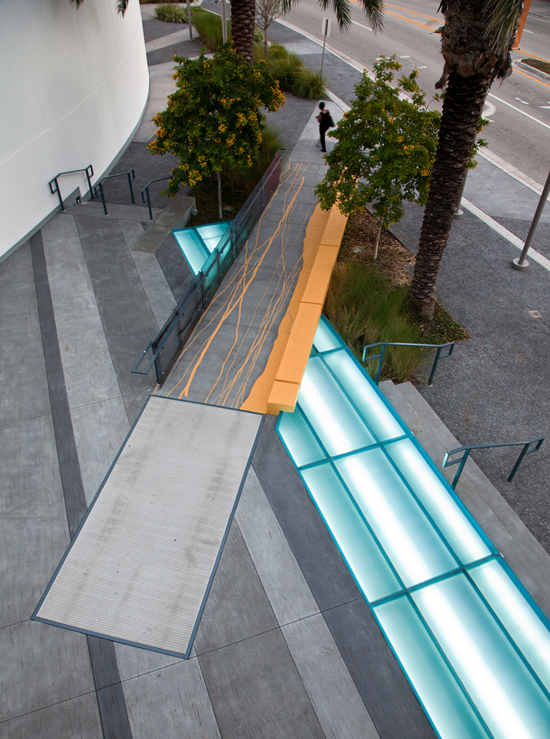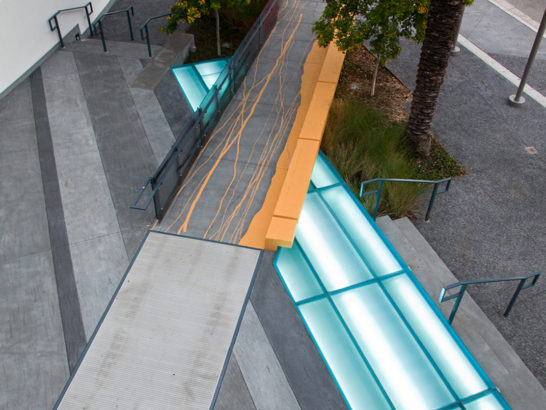 THRESHOLD I, by Margi Glavovic Nothard is a commissioned large scale site specific artwork conceptualizing water and surface, inscription and materiality through the lens of Florida’s natural environments. Sited on Las Olas Boulevard, the installation reinforces the urban edge and thoughtfully resolves accessibility through a sandblasted ground plane drawing/bench and eco resin photo montage/railing floating above a blue 7’ x 44’ glowing glass box. Additional native grasses planted around the work provide a slower and softer transition between the city’s sidewalk and the Museum’s plaza. Photography by Robin Hill.